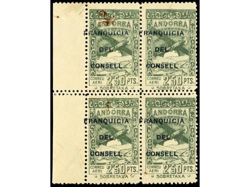 ** ANDORRA. Ed. NE33ddpv(2). 2,50 pts. verde en bloque de 4 con DOBLE DENTADO ENTRE LOS SELLOS (2 parejas verticales). El sello superior izquierdo mancha en el anverso. RARO. OCASION. Cat. 300€.