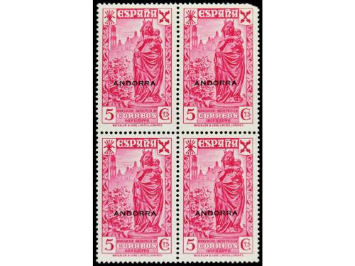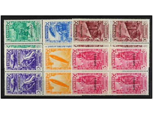 ** COLONIAS ESPAÑOLAS: ANDORRA. Ed. 1/6 (4). BENEFICIENCIA. SERIE COMPLETA. 6 valores en bloque de cuatro. Un valor de 5 cts. falta diente en esquina. Cat. 1.940€.