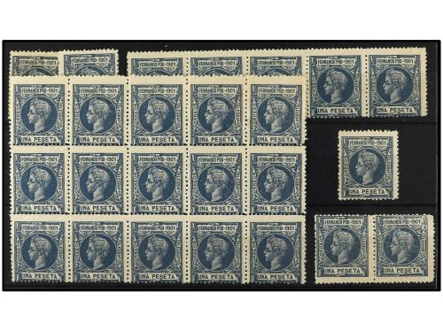 ** COLONIAS ESPAÑOLAS: FERNANDO POO. Ed. 104 (25). 1 pta. verde azulado. 25 ejemplares sueltos o en bloques. Calidad diversa. EXAMINAR. Cat. 3.500€.
