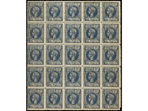 ** COLONIAS ESPAÑOLAS: FERNANDO POO. Ed. 104 (25). 1 pta. verde azulado. 25 ejemplares en bloque. Calidad diversa. EXAMINAR. Cat. 3.500€.