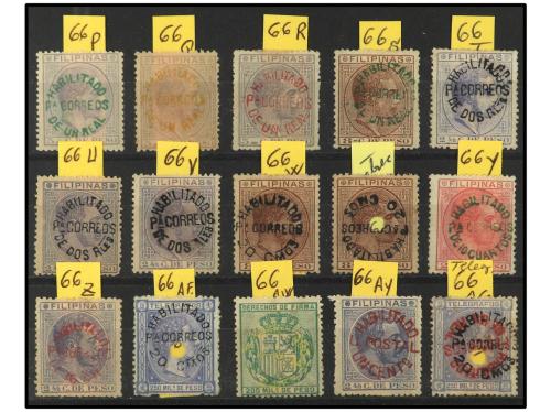 */(*) COLONIAS ESPAÑOLAS: FILIPINAS. Ed. 66P/AY. Ficha conteniendo 15 sellos diferentes. Todos etiquetados. RAROS. OCASION. A EXAMINAR. Cat. +203€.