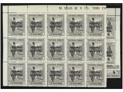 ** COLONIAS ESPAÑOLAS: GUINEA. Ed. 232his. 5 c. castaño, habilitación en azul e invertida. 29 sellos en bloques. Cat. 3.103€.