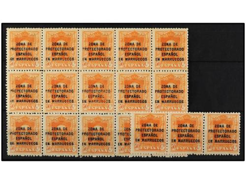 ** COLONIAS ESPAÑOLAS: MARRUECOS. Ed. 88 (28). 50 cts. naranja. 28 sellos en bloques. En general buena calidad. EXAMINAR. Cat. 2.800€.