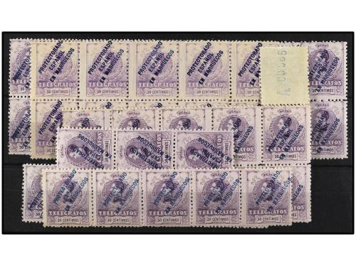 ** COLONIAS ESPAÑOLAS: MARRUECOS. Ed. 4 (69). TELÉGRAFOS. 30 cts. violeta. 69 sellos en tiras o bloques. En general buena calidad. Cat. 1.725€.