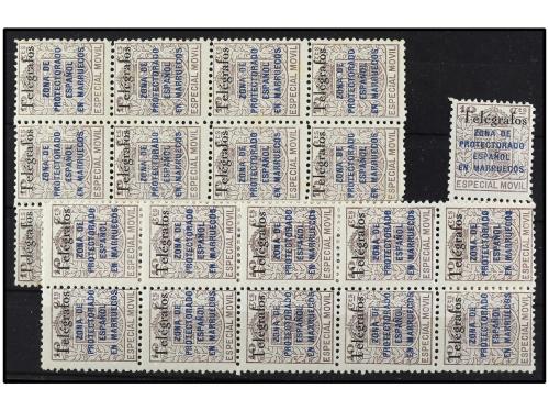 ** COLONIAS ESPAÑOLAS: MARRUECOS. Ed. 34Ahcc (24). TELÉGRAFOS. 10 cts. castaño. CAMBIO DE COLOR EN LA HABILITACIÓN. 24 ejemplares en bloques y sueltos. Algún valor pequeño defecto. EXAMINAR. Cat. 1.200€.