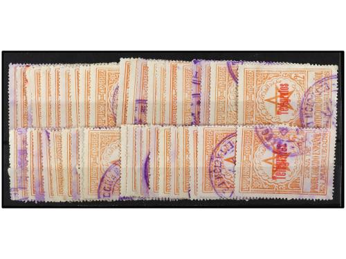 ° COLONIAS ESPAÑOLAS: MARRUECOS. Ed. 34G y 34K (21). TELÉGRAFOS. 10 pts. naranja con habilitaciones tipos I y II. 21 ejemplares. EXAMINAR. Cat. 1.701€.