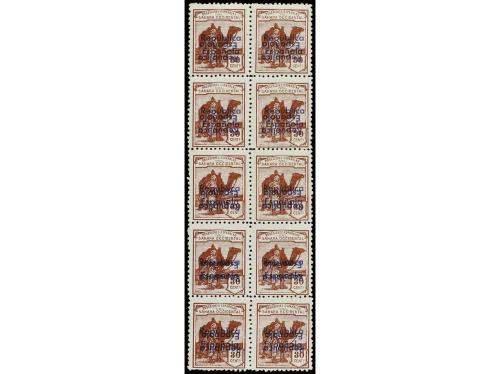 ** COLONIAS ESPAÑOLAS: SAHARA. Ed. 41Bhhi (10). 30 cts. castaño rojizo. Bloque de 10 con HABILITACIÓN DOBLE, UNA INVERTIDA. Buena calidad. Cat. 1.250€.