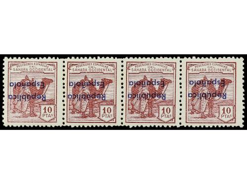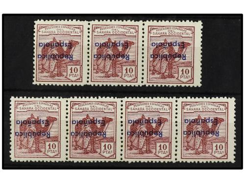 ** COLONIAS ESPAÑOLAS: SAHARA. Ed. 47 Bhi (7). 10 pts. carmín violeta. 7 sellos en tiras con HABILITACIÓN INVERTIDA. Algún valor con pliegue. EXAMINAR. Cat. 2.170€.