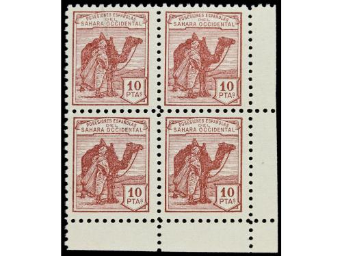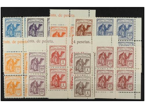 ** COLONIAS ESPAÑOLAS: SAHARA. Ed. NE 1/10. SERIE COMPLETA, 10 valores NO EXPENDIDOS. Bloques de cuatro. Dos sellos de 10 pts. marcas en la goma. EXAMINAR. Cat. +1.540€.