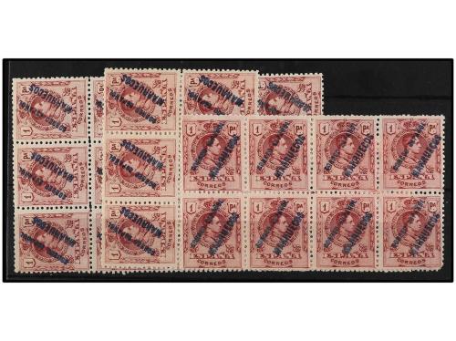 ** COLONIAS ESPAÑOLAS: TANGER. Ed. 9. 1 peseta carmín. 30 sellos en bloques. Hay bien centrados. Cat. 3.000€.