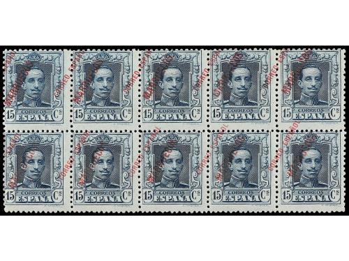 ** COLONIAS ESPAÑOLAS: TANGER. Ed. 53var. 15 c. verde. Bloque de 10, variedades HABILITACIÓN DESPLAZADA . Cat. +950€.