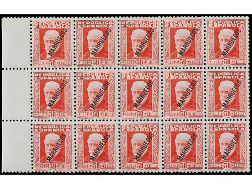 ** COLONIAS ESPAÑOLAS: TANGER. Ed. 77 (15). 30 cts. carmín. Bloque de 15. Valor clave de la serie. RARO. Cat. 2.400€.