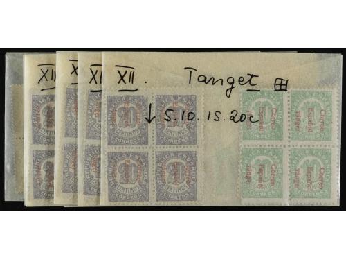 ** COLONIAS ESPAÑOLAS: TANGER. Ed. 96/9heat, heai. 5 cts. a 25 cts. 4 valores. Variedad "Tanget". Cinco bloques de cuatro con habilitación normal y cinco bloques de cuatro con habilitación invertida. (2 bloques de cada con fijasellos). Cat. +340€.