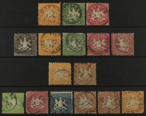 ALEMANIA ANTIGUOS ESTADOS: WURTEMBERG. Ficha conteniendo 16 sellos usados en calidades diversas. Alto valor en catálogo. EXAMINAR.