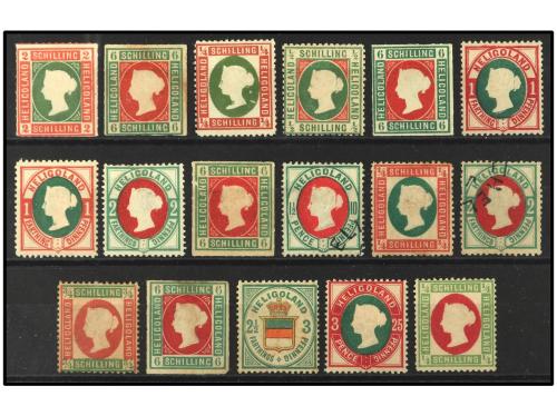*/(*)/° COLONIAS INGLESAS. HELIGOLAND. Ficha con 17 sellos diferentes. Sin garantía. Se vende tal cual. A EXAMINAR. Yvert 1.220€.