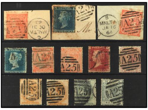 ° COLONIAS INGLESAS. MALTA. Ficha con 12 sellos clásicos: 8 de G. BRETAÑA con matasellos de MALTA Y 4 de MALTA. A EXAMINAR. Yvert +700€.