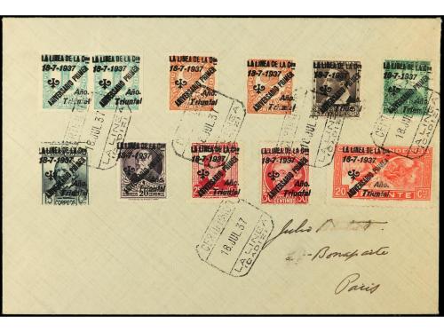 ESPAÑA E. LOCALES PATRIOTICAS: LA LINEA DE LA CONCEPCION. Ed. 45/53. Carta de la LINEA DE LA CONCEPCION a Julio Restart en PARIS el 18 Jul. 1937 franqueada con la serie completa. RARISIMA.