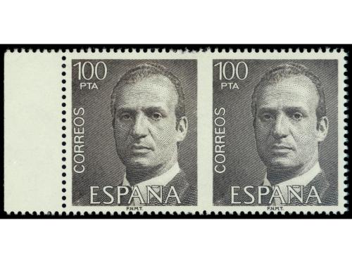 ** ESPAÑA. Ed. 2605sph. JUAN CARLOS I. 100 pts. castaño en pareja horizontal SIN DENTAR POR EN MEDIO. Borde lateral de hoja. Cert. CEM. MUY RARO.