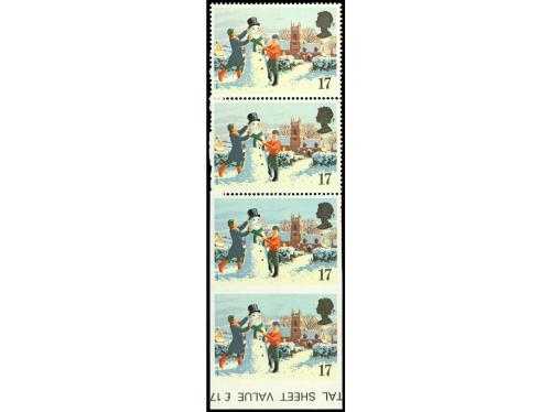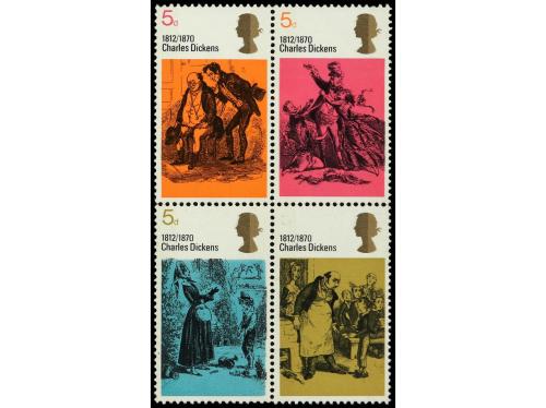 ** GRAN BRETAÑA. Sg. 824/7 var. 1970. CENTENARIO DE LA MUERTE DE CHARLES DICKENS. Bloque de 4 con todos los sellos con variedad COLOR PLATA CASI COMPLETAMENTE OMITIDO y el cuarto sello CIFRA DEL VALOR PARCIALMENTE OMITIDA. Cert. B.P.A. y David Brandon. MAGNIFICO. MUY RARO.