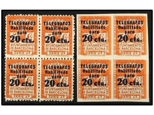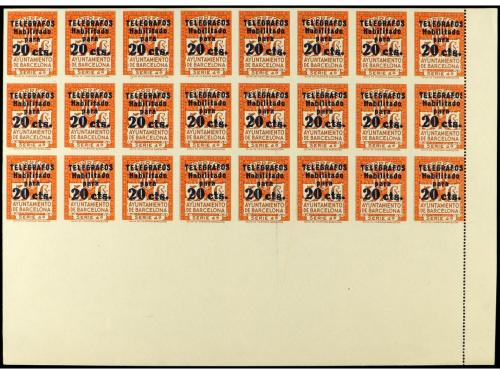 (*) ESPAÑA: AYUNTAMIENTO DE BARCELONA. Ed. T.11s/ns... TELEGRAFOS. 20 cts. s. 5 cts. naranja y castaño en bloque de 24 DENTADO 16 SOLO EL MARGEN DERECHO (3 sellos), el resto SIN DENTAR y 16 sellos SIN NUMERACION (solo numerada la fila central). RARO. OCASION.