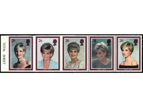 ** GRAN BRETAÑA. Sg. 2021/5 var. 1998. PRINCESA DIANA. Tira horizontal de 5 sellos con variedad los 2 sellos de la izquierda SIN DENTAR y el 3º con DENTADO PARCIAL. El Stanley Gibbons referencia una tira de 3 completamente sin dentar (SG. 2021-11.750£). MAGNIFICA. MUY RARA.