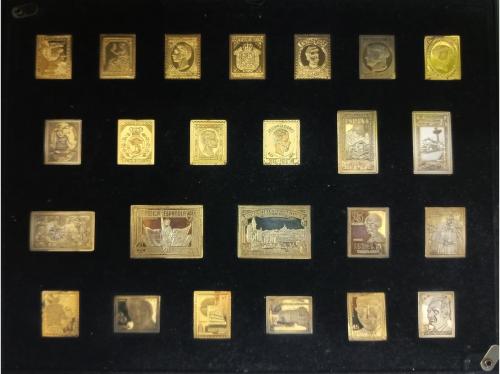 VARIOS. EMISION ESPECIAL CONMEMORATIVA DE LOS 150 AÑOS DEL SELLO EN ESPAÑA. Colección compuesta por 24 reproducciones acuñadas en plata de 925 y bañadas en oro de primera ley. Editado por Correos y Telégrafos. Estuche original con certificado de autenticidad. OCASION. A EXAMINAR.