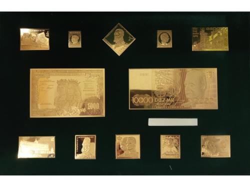VARIOS. VALORES REALES. Colección compuesta por 10 réplicas de sellos y 2 réplicas de billetes acuñadas todas en plata maciza 999 (peso 667 grs.) y chapadas en oro de 24 quilates. Edición limitada a 7.500 colecciones. Estuche original algo deteriorado pero las réplicas impecables. OCASION.