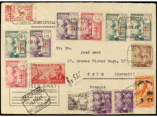 ✉ ESPAÑA. Ed. 936(2), 937(3), 938, 888, etc... Carta certificada con espectacular franqueo de VALENCIA a SETE (FRANCIA) con CENSURA y llegada al reverso. MAGNIFICA. MUY RARA.