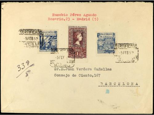 ✉ ESPAÑA. Ed. 979, 982 y 1079. Carta certificada de MADRID a SAN SEBASTIAN el 5 Feb. 1952. Raro franqueo. PRECIOSA.