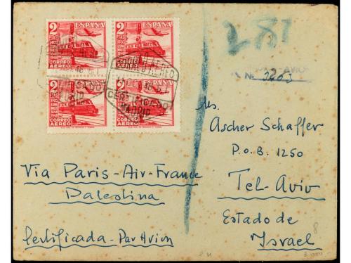 ✉ ESPAÑA. Ed. 1039(4). Bloque de 4 en carta certificada y por avión el 11 Oct. 1948 a TEL-AVIV (ISRAEL) y llegada a HAIFA. Espectacular franqueo y destino. PRECIOSA. MUY RARA.