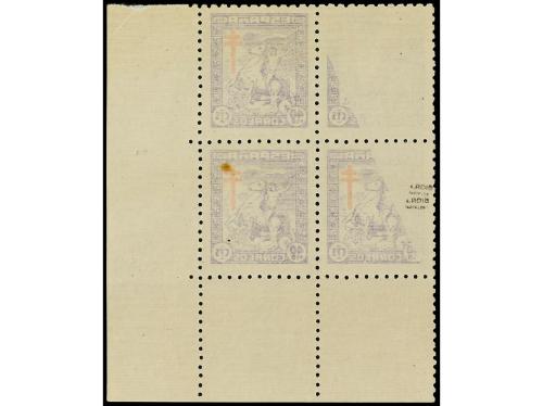 ** ESPAÑA. Ed. 986ic (4). 40 cts. + 10 cts. violeta. Bloque de cuatro IMPRESIÓN CALCADA AL DORSO (2 parcialmente). Un sello sombra del tiempo. RARO y NO RESEÑADO. Marquilla Roig.