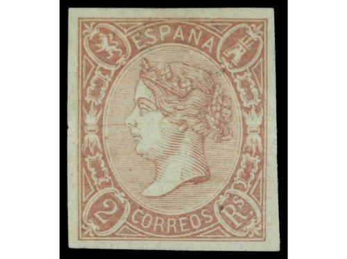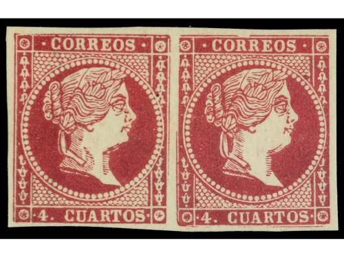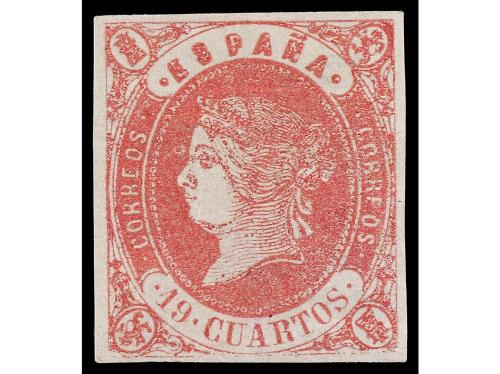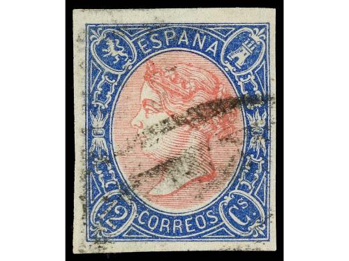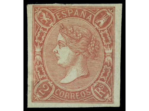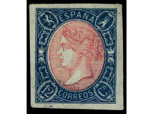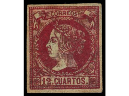 * ESPAÑA. Ed. 53p. 12 cuartos carmín con PAPEL DELGADO. Cert. CEM y COMEX. PRECIOSO. RARO. Cat. 610€.