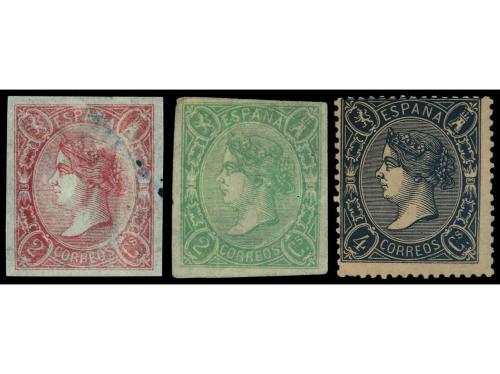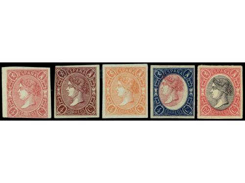 ESPAÑA. Ed. 75P(4) y 76P. 4 PRUEBAS del 4 cuartos: rosa, castaño rojo, naranja y azul y rosa. Además una del 12 cuartos en carmín y negro (Galvez 318, 323/4, 326 y 331). PRECIOSAS. RARAS.
