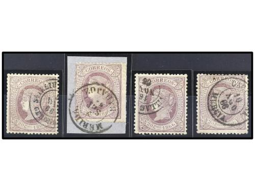 ° ESPAÑA. Ed. 86 (4). 20 cts. lila. Conjunto de 4 sellos con mat. fechador. Muy bonitos. Cat. 408€.