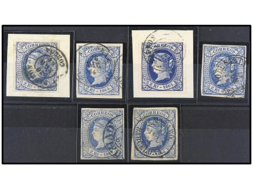 ° Δ ESPAÑA. Ed. 68. 2 reales azul. Conjunto de 6 sellos con mat. fechador.