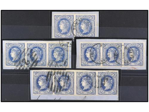 Δ ESPAÑA. Ed. 68 (12). 2 reales azul. Pareja, 2 tiras de 3 y 1 tira de cuatro, sobre fragmentos. PRECIOSOS.