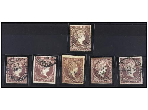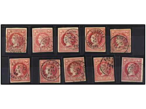 ° ESPAÑA. Ed. 53 (10). 12 cuartos carmín, 10 sellos con matasellos fechadores. BONITOS.