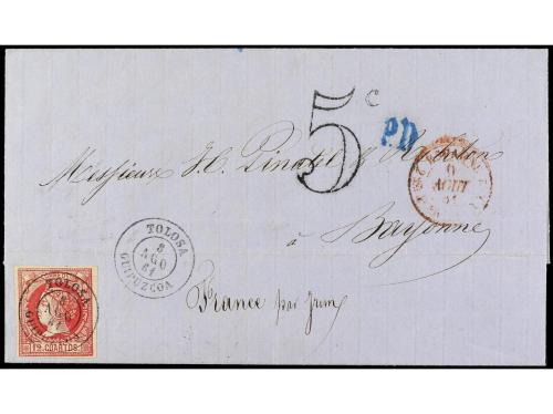✉ ESPAÑA. Ed. 53. 1861. TOLOSA a FRANCIA. 12 cuartos carmín. PRECIOSA.