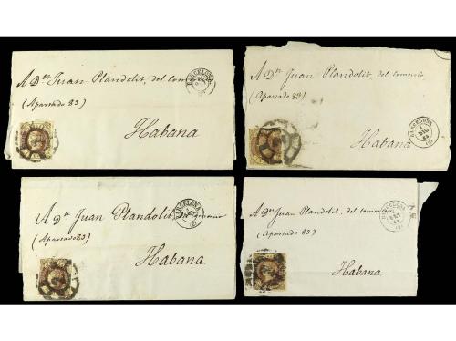 ✉ ESPAÑA. Ed. 61 (4). CUATRO CARTAS circuladas a HABANA con sello de 1 real castaño.