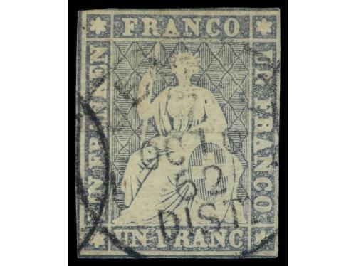 ° SUIZA. Yv. 31a. 1 fr. gris lila. Bonito pese a tener algún margen ligerísimamente corto. RARO. A EXAMINAR. Yvert 900€.