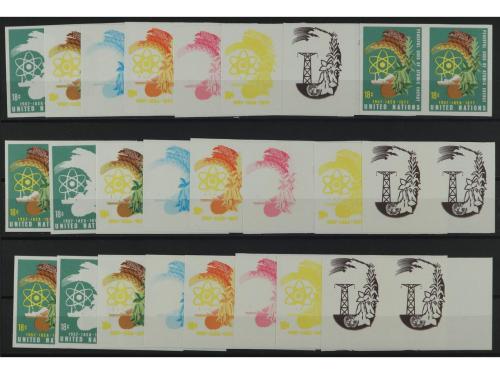** NACIONES UNIDAS. Ed. 282s. N. YORK. Conjunto compuesto por 3 parejas SIN DENTAR (del sello definitivo) y 21 parejas más con el sello SIN DENTAR en diferentes estados de impresión. Además se añade 692s(8) en bloque de 8 SIN DENTAR con INTERPANEL. No catalogados. Raro conjunto. OCASION.