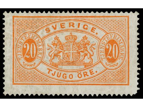 * SUECIA. Yv. 1B/10B. 1874-1881. SERVICIO. 3 öre a 50 öre, dentado 14. Valores de 3 y 4 öre pliegue vertical (vertical fold), 5 öre goma no original (not original gum) y 24 öre reparado (repaired). Yvert 3.620€.