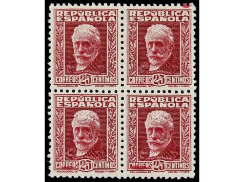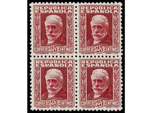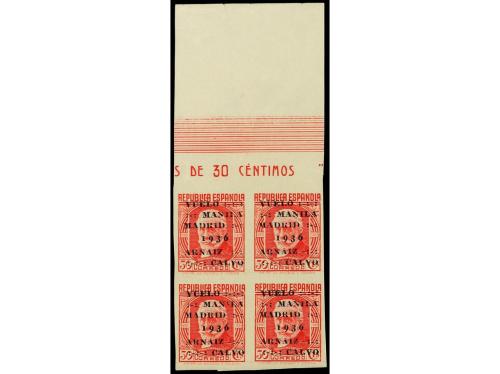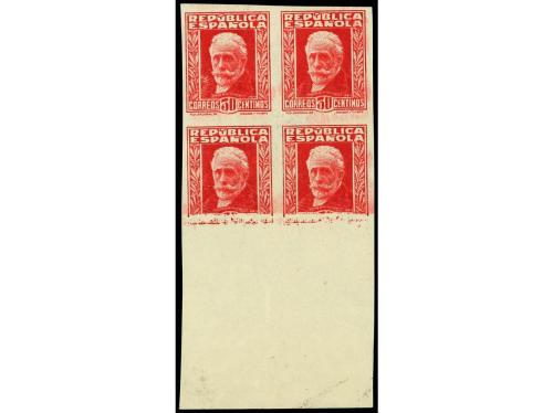 ** ESPAÑA. Ed. 669s/ips. 30 cts. carmín en bloque de 4 SIN DENTAR. Los sellos inferiores IMPRESION PARCIAL (solo catalogado dentado). Borde de hoja. MUY BONITO.