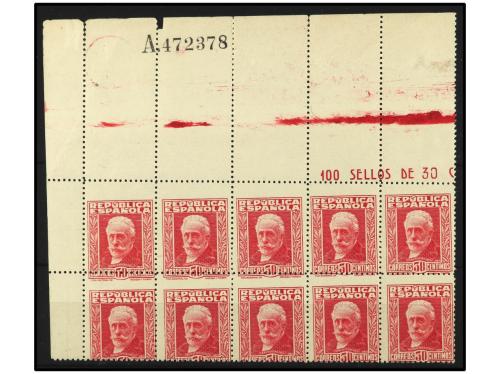 ** ESPAÑA. Ed. 669dx(10). 30 cts. carmín en bloque de 10 con DENTADO DESPLAZADO EN DIAGONAL. Esquina de pliego. OCASION.