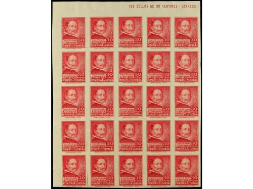 ** ESPAÑA. Ed. 726s(25). 30 cts. carmín en bloque de 25 SIN DENTAR. Esquina de pliego con leyenda. OCASION. Cat. 1.100€.