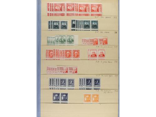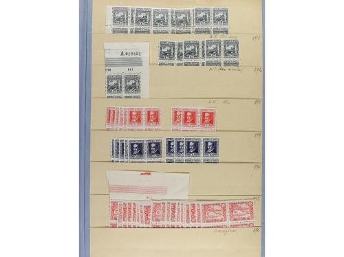 ** ESPAÑA. Ed. 655/61. STOCK de sellos sueltos: 5 cts. (80), 10 cts. (36), 15 cts. (24), 25 cts. (4) y 30 cts. (12). Todos en bloques de cuatro. Se incluyen algunos valores en usado. A EXAMINAR. Cat. 3.056€.