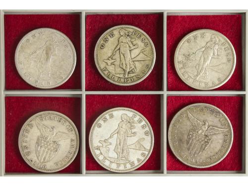 FILIPINAS. Lote 6 monedas 1 Peso. 1903 a 1910. SAN FRANCISCO. Administración Norteamericana. Todas diferentes: 1903S, 1904S, 1907S, 1908S, 1909S y 1910S. A EXAMINAR. KM-168, 172. MBC a EBC.