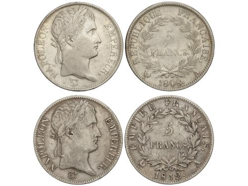 FRANCIA. Lote 2 monedas 5 Francs. 1808-A y 1812-A. NAPOLEON EMPEREUR. PARÍS. A EXAMINAR. KM-686.1. MBC- y MBC.