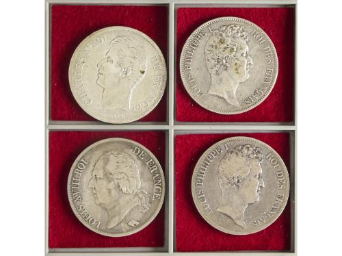 FRANCIA. Lote 4 monedas 5 Francs. 1824-w, 1830-W, 1830-T y 1831-BB. LOUIS XVIII, CHARLES X y LOUIS PHILIPPE I (2). A EXAMINAR. BC+ a MBC.