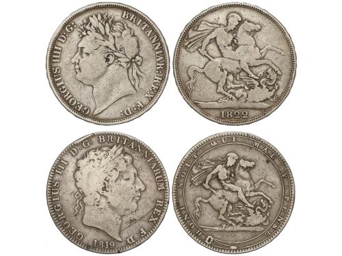 GRAN BRETAÑA. Lote 2 monedas Crown. 1819 y 1822. GEORGE III y GEORGE IV. (Golpecitos). KM-675, 680.2. MBC-.